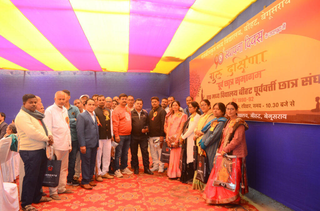 बेगूसराय(बीहट)। सबकी आंखें नम थी, शिक्षक शिक्षक से मिल रहे थे। छात्र अपने सहपाठी से मिले थे और गुरु अपने शिष्य मिल रहे थे। यह दृश्य 32 वर्षों बाद राजकीयकृत मध्य विद्यालय बीहट लौटा था। मौका था राजकीयकृत मध्य विद्यालय बीहट के 90 वें स्थापना दिवस पर सत्र 1990-92 के छात्रों द्वारा आयोजित गुरु दक्षिणा सह पूर्व छात्र समागम का। इस अवसर पर लगभग 50 की संख्या में जुटे पूर्ववर्ती छात्रों द्वारा अपने समय के कुल 25 शिक्षकों का सम्मान किया गया। जिसमें 7 दिवंगत शिक्षकों के परिवार को भी सम्मानित किया गया। इसके पूर्व कार्यक्रम का शुभारंभ राजकीयकृत मध्य विद्यालय बीहट के छात्र-छात्राओं द्वारा विद्यालय आए अवकाश प्राप्त शिक्षकों का स्वागत चन्दन, आरती और स्वस्तिवाचन और शंख ध्वनि से किया गया। वहीं कार्यालय से लेकर मुख्य मंच तक छात्र-छात्राओं द्वारा पुष्प वर्षा करते हुए उनका अभिनंदन किया गया। कार्यक्रम का शुभारंभ दीप प्रज्ज्वलित कर अवकाश प्राप्त शिक्षकों सहित विद्यालय के पूर्ववर्ती छात्र व तेघरा विधायक रामरतन सिंह के द्वारा किया गया। मौके पर सभी शिक्षकों का सम्मान प्रशस्ति सह सम्मान पत्र, अंग वस्त्र, रामचरितमानस और औषधीय पौधा भेंट कर किया गया। अलग-अलग क्षेत्रों में काम कर रहे पूर्ववर्ती छात्रों द्वारा जहां शिक्षकों का सम्मान करते हुए मन गदगद हो रहा था वहीं दूसरी तरफ हर शिक्षकों की आंखें नम थी। वह अपने छात्रों के प्रति बार-बार कृतज्ञता अर्पित कर रहे थे। मौके पर स्वागत भाषण करते हुए पूर्ववर्ती छात्र मनीष कुमार ने कहा कि हम इस योग्य नहीं है कि गुरु को दक्षिणा दे सकते हैं बल्कि हम केवल और केवल गुरु वंदना ही कर सकते हैं। उन्होंने कहा कि हम सब के लिए यह अविस्मरणीय यह पल है जिसको हम एक बार फिर से जी रहे हैं।