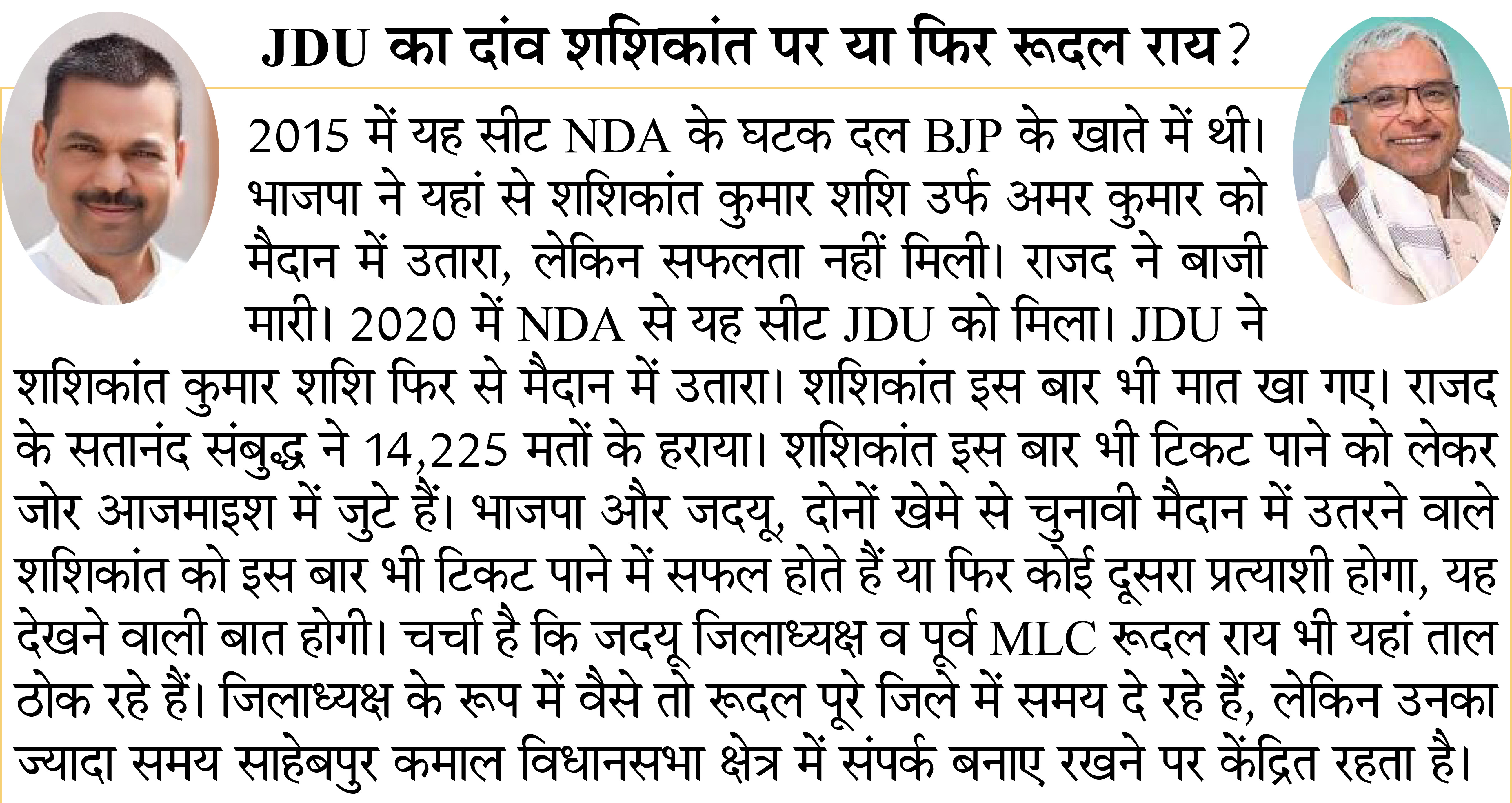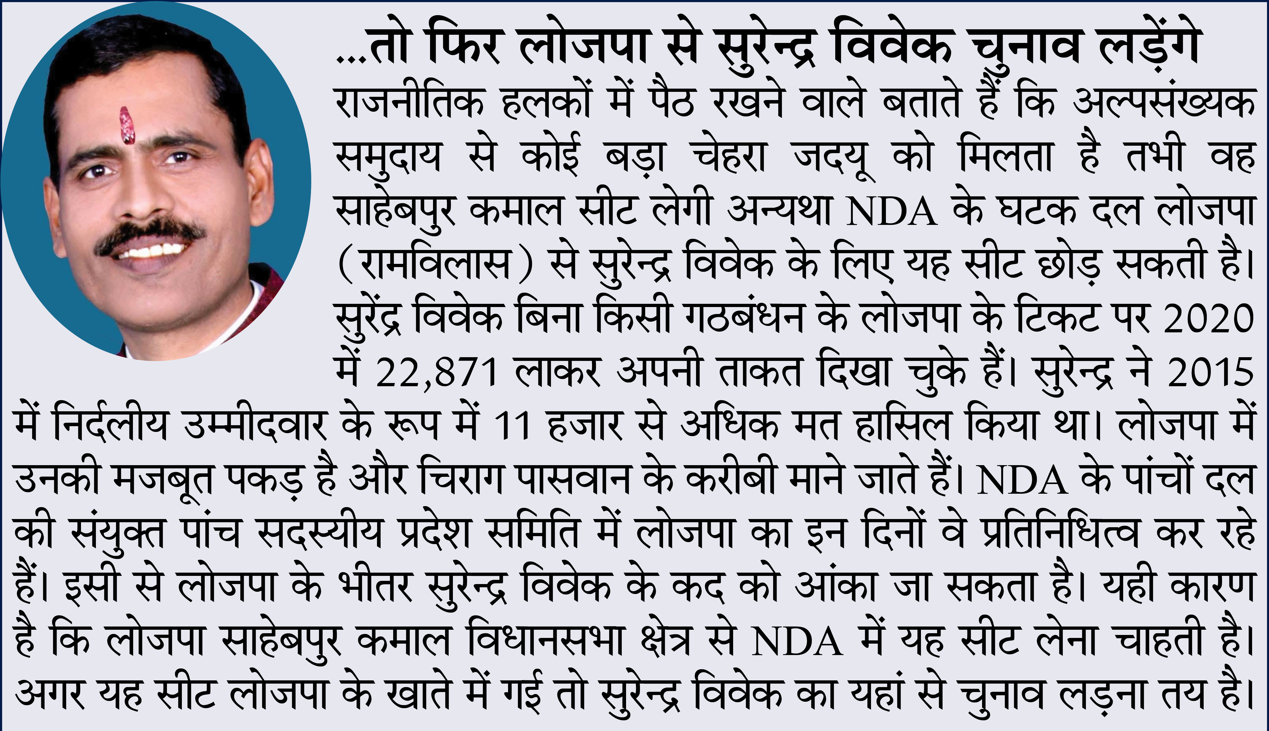 2019 के लोकसभा चुनाव में NDA के प्रत्याशी गिरिराज सिंह ने साहेबपुर कमाल विधानसभा क्षेत्र से 75,324 मत लाकर राजद के डॉ. तनवीर हसन से 35,466 मत और 2024 में 74,943 मत हासिल कर महागठबंधन प्रत्याशी अवधेश राय से 1443 मतों से बढ़त बनाई थी। दोनों साल इस बढ़त में सुरेन्द्र विवेक का बड़ा योगदान माना जाता है। गिरिराज सिंह व सुरेंद्र विवेक दोनों ही भूमिहार जाति से आते हैं। यह बात और है कि चुनाव के समय क्षेत्र में गिरिराज सिंह को हिन्दू सम्राट के रूप में पेश किया जाता है और वे मुस्लिम मतदाताओं के यहां वोट भी मांगने नहीं जाते हैं। इस कारण वोट की गोलबंदी हिन्दू-मुस्लिम के आधार पर इस क्षेत्र में हो जाती है। दरअसल, इस क्षेत्र में सबसे ज्यादा आबादी यादव की है। दूसरे नंबर पर मुस्लिम व तीसरे स्थान पर धानुक-कुर्मी। हालांकि यहां पचकोनिया वोट की भी कमी नहीं है। इतना तय है कि यहां NDA व महागठबंधन आमने-सामने होंगे। इस कारण सबकी नजर NDA का प्रत्याशी कौन होगा, इस पर टिकी है।