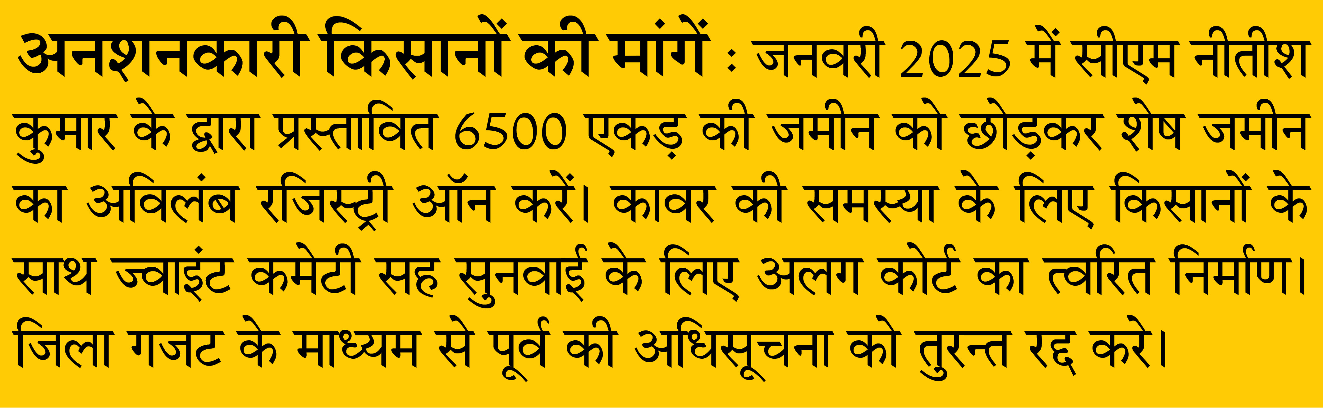 बेगूसराय (मंझौल) | कावर महापंचायत के किसान शनिवार को तीसरे दिन भी आमरण अनशन पर बैठे। किसानों का कहना था कि मुख्यमंत्री नीतीश कुमार ने जनवरी 2025 में कहा था कि 6500 एकड़ जमीन पक्षी अभयारण्य के लिए लेकर होगी शेष जमीन किसानों को वापस कर दी जाएगी। बावजूद सात महीने में कोई सुधार नहीं हुआ। सुधार की जगह पर कभी चेक डेम बनाकर जमीन को जलप्लावित करने का उपाय किया गया तो अब राजस्व महाभियान में भी कावर के जमीन की अनदेखी की गई। इसी बीच शनिवार को दरभंगा स्नातक क्षेत्र के विधान पार्षद सर्वेश कुमार आमरण अनशन पर बैठे किसानों के बीच पहुंचे। उन्होंने किसानों से बात की। कहा कि मैं भी किसान का बेटा हूं। किसानों की जटिल समस्याओं को समझता हूं। समस्याओं का निदान करना हमारी नैतिक जिम्मेदारी है। उन्होंने आश्वासन देते हुए जूस पिलाकर आमरण अनशन तुड़वाया।