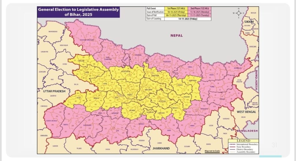 पटना | बिहार विधानसभा चुनाव 2025 का ऐलान सोमवार को हो गया। बिहार में दो चरणों में चुनाव कराए जाएंगे। newsvistabih.com ने इस बारे में सूत्रों के जरिए दो दिन पहले ही बता दिया था। मुख्य चुनाव आयुक्त ज्ञानेश कुमार ने प्रेस कांफ्रेंस कर बताया कि पहले चरण का मतदान 6 नवंबर और दूसरे चरण का मतदान 11 नवंबर को होगा। मतों की गिनती 14 नवंबर को की जाएगी।