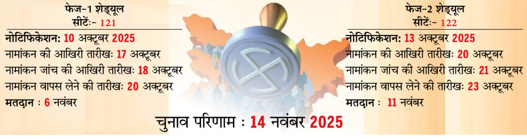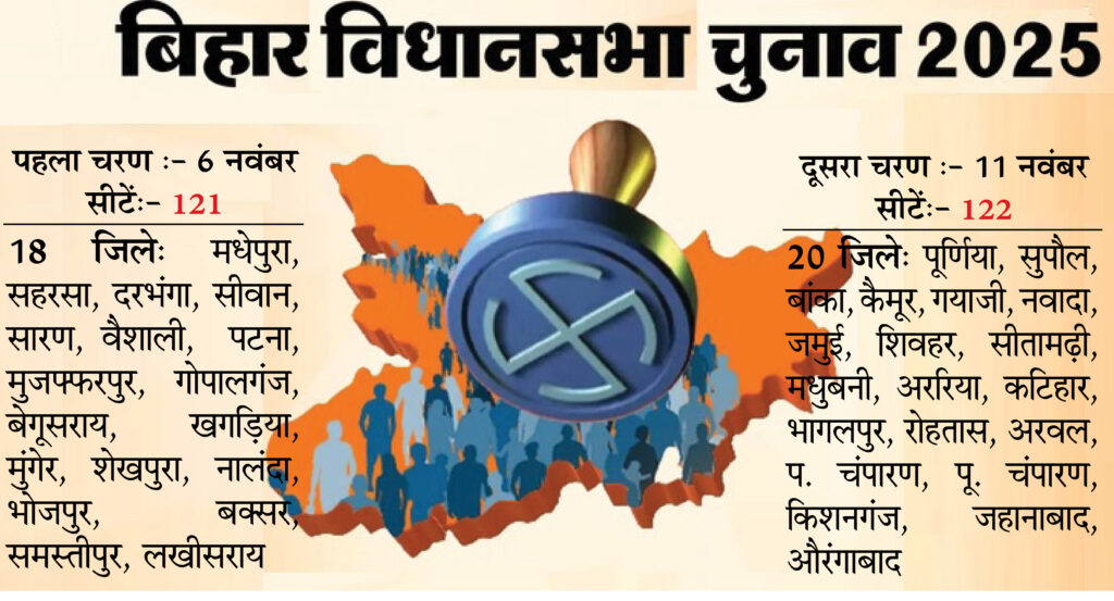 पटना | बिहार विधानसभा चुनाव 2025 का ऐलान सोमवार को हो गया। बिहार में दो चरणों में चुनाव कराए जाएंगे। newsvistabih.com ने इस बारे में सूत्रों के जरिए दो दिन पहले ही बता दिया था। मुख्य चुनाव आयुक्त ज्ञानेश कुमार ने प्रेस कांफ्रेंस कर बताया कि पहले चरण का मतदान 6 नवंबर और दूसरे चरण का मतदान 11 नवंबर को होगा। मतों की गिनती 14 नवंबर को की जाएगी।
