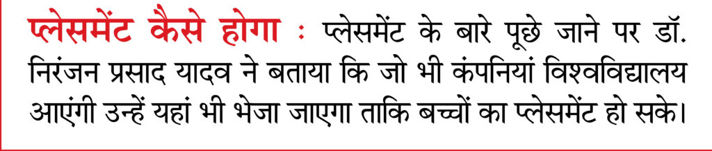 कुलसचिव प्रो. (डॉ.) निरंजन प्रसाद यादव ने कहा कि यहां मेधावी बच्चे बहुत हैं, लेकिन सही प्लेटफार्म नहीं मिलने के कारण वे सही मुकाम नहीं हासिल कर पाते हैं। बच्चे यहां स्टूडेंट क्रेडिट कार्ड योजना के तहत भी पढ़ाई करेंगे। उन्हें फीस के रूप में एक भी पैसा नहीं देना होगा। प्लेटसमेंट संबंधित पूछे सवाल पर उन्होंने कहा कि जो भी कंपनियां विश्वविद्यालय आएंगी उन्हें यहां भी भेजा जाएगा ताकि बच्चों का प्लेसमेंट हो सके। उन्होंने डायरेक्टर इंजी. अभिनव आनंद से आग्रह किया कि वे अगले साल से एमसीए और एमबीए की भी पढ़ाई यहां आरंभ कराएं। हॉस्टल की व्यवस्था करें। बच्चों को स्कॉलरशिप के माध्यम से यह सुविधा नि:शुल्क मिलेगी।