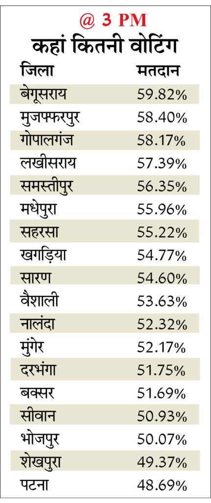 निर्वाचन आयोग के अनुसार, लखीसराय, समस्तीपुर, मधेपुरा, सहरसा जिले के मतदाता भी वोट डालने में उत्साह दिखा रहे हैं। जिन 18 जिलों में वोटिंग हो रही है उनमें से 16 जिले में दोपहर 3 बजे तक 50 प्रतिशत से अिधक वोटिंग हो चुकी है। केवल शेखपुरा और पटना ही दो ऐसे जिले हैं जहां मतदान 50 प्रतिशत से नीचे हैं।