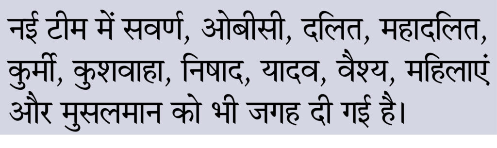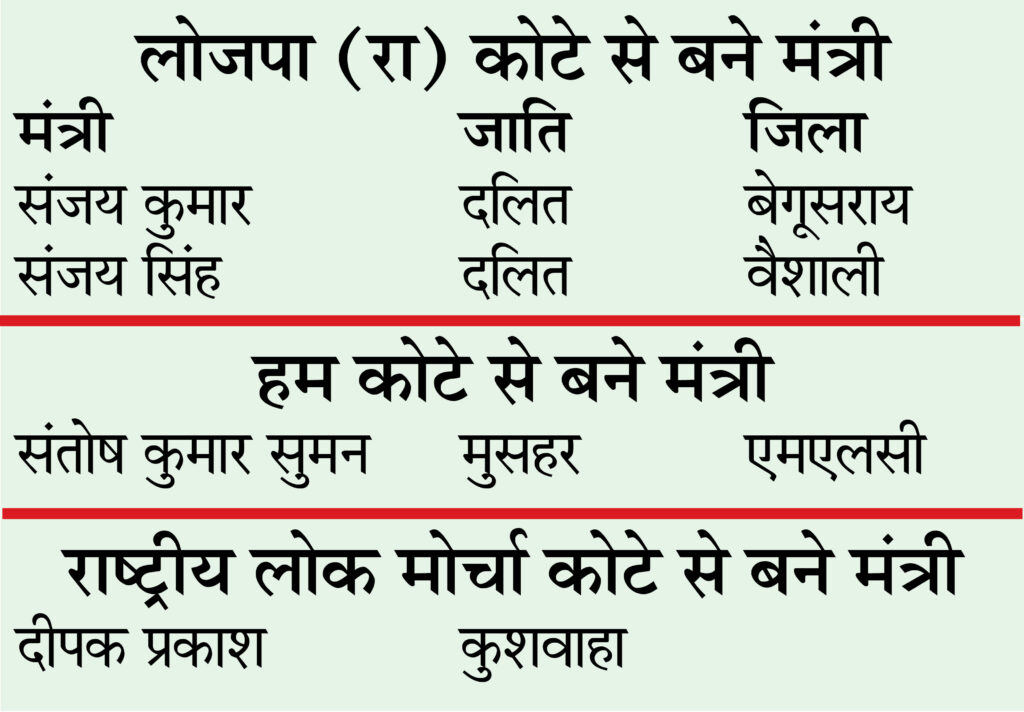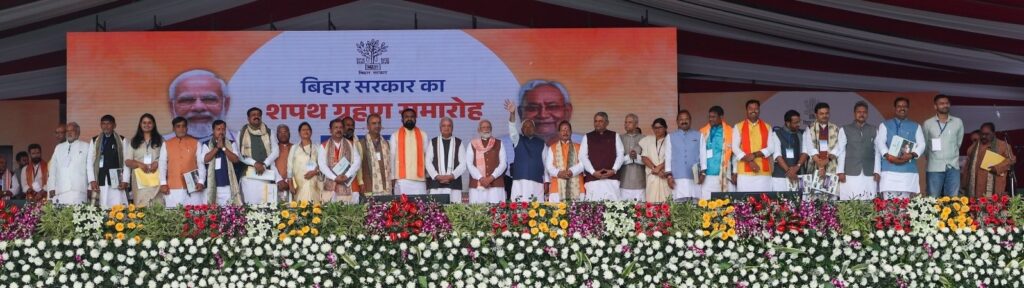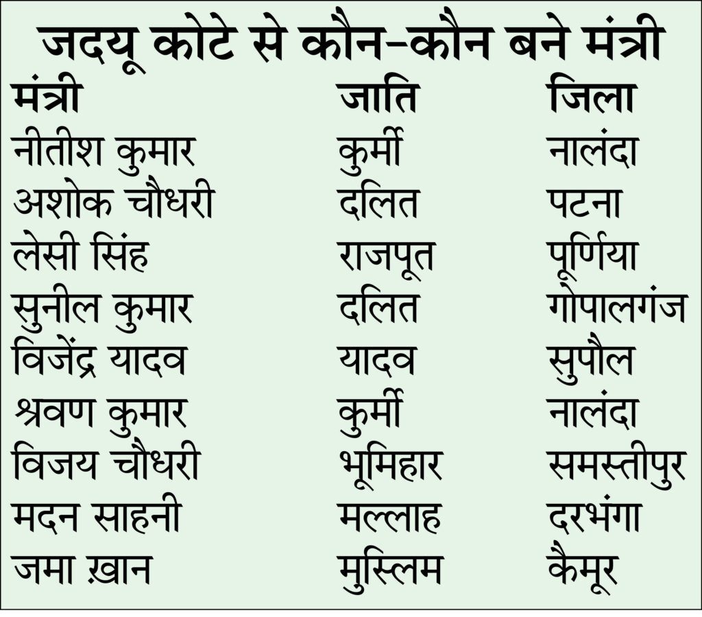 पटना | नीतीश कुमार ने 20 नवंबर 2025 को बिहार के सीएम के रूप में 10वीं बार शपथ ली। अपनी नई कैबिनेट में उन्होंने हर समुदाय को भागीदारी दी। कैबिनेट में नीतीश समेत 27 मंत्री हैं। मंत्रियों की सूची देखें तो टीम में सवर्ण, ओबीसी, दलित, महादलित, कुर्मी, कुशवाहा, निषाद, यादव, वैश्य, महिलाएं और मुसलमान को भी जगह दी गई है। विधानसभा चुनाव 2025 में प्रचंड बहुमत (202) मिलने के बाद NDA खासकर भाजपा किसी भी वर्ग को नाराज नहीं करना चाहती। वह दिखाना चाहती है कि सभी वर्गों काे प्रतिनिधित्व दिया गया है। घटक दलों को भी जिसकी जितनी भागीदारी उसकी उतनी हिस्सेदारी के तहत मंत्री पद दिया गया है।