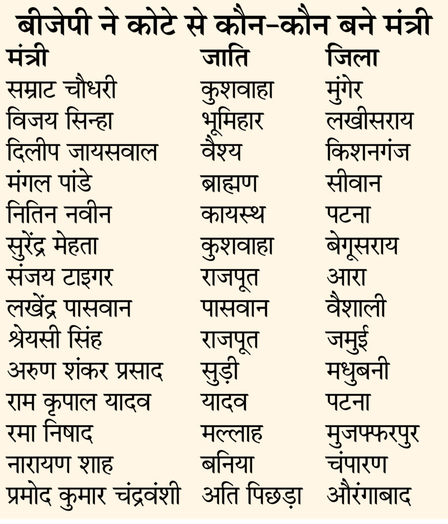 पटना | नीतीश कुमार ने 20 नवंबर 2025 को बिहार के सीएम के रूप में 10वीं बार शपथ ली। अपनी नई कैबिनेट में उन्होंने हर समुदाय को भागीदारी दी। कैबिनेट में नीतीश समेत 27 मंत्री हैं। मंत्रियों की सूची देखें तो टीम में सवर्ण, ओबीसी, दलित, महादलित, कुर्मी, कुशवाहा, निषाद, यादव, वैश्य, महिलाएं और मुसलमान को भी जगह दी गई है। विधानसभा चुनाव 2025 में प्रचंड बहुमत (202) मिलने के बाद NDA खासकर भाजपा किसी भी वर्ग को नाराज नहीं करना चाहती। वह दिखाना चाहती है कि सभी वर्गों काे प्रतिनिधित्व दिया गया है। घटक दलों को भी जिसकी जितनी भागीदारी उसकी उतनी हिस्सेदारी के तहत मंत्री पद दिया गया है।