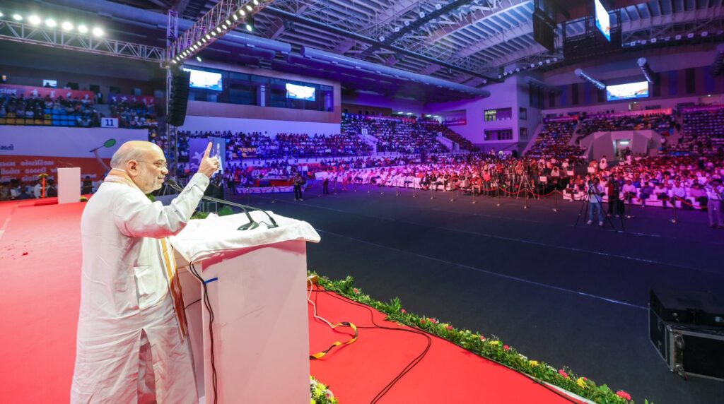 अहमदाबाद में खिलाड़ियों को संबोधित करते अमित शाह। फोटो : मंत्री के X हैंडल से।