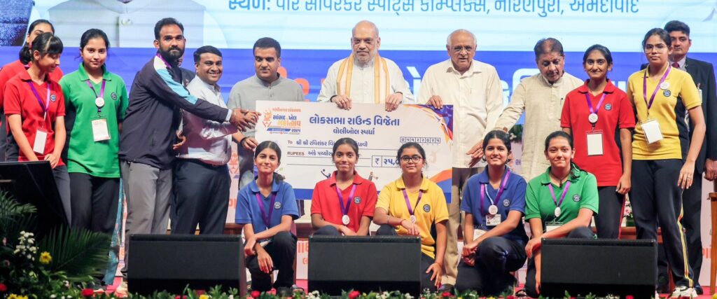 सांसद खेल महोत्सव में खिलाड़ियों को पुरस्कृत करते अमित शाह। फोटो: मंत्री के X हैंडल से