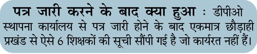 डीपीओ स्थापना कार्यालय में तैनात एक कर्मचारी ने बताया कि सभी विद्यालयों के शिक्षकों की उपस्थिति का डाटा कार्यालय से ही एचआरएमएस पोर्टल पर अपलोड किया जाता है। उपस्थिति के अनुसार ही शिक्षकों का वेतन बनता है। इस बार भी जब वेतन बनाने का समय आया तो पाया गया कि जिले में कार्यरत करीब 110 शिक्षकों की हाजिरी अक्टूबर से नहीं मिल रही। इस बात की जानकारी जिला शिक्षा पदाधिकारी मनोज कुमार को दी गई। उन्होंने सभी बीईओ को पत्र लिखते हुए 24 घंटे के अंदर इन शिक्षकों की जानकारी उलपब्ध कराने को कहा।