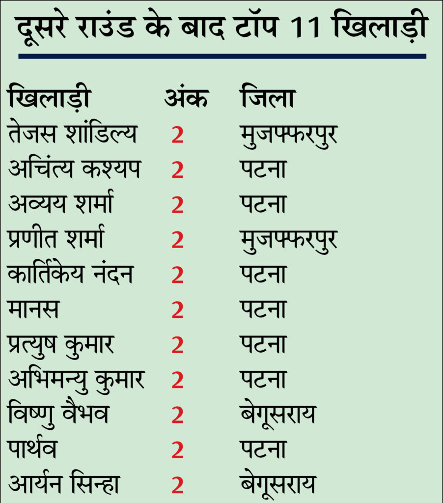 काले मोहरे से खेलते हुए AGM तेजस शांडिल्य ने खगड़िया के मानस को हराकर तीसरे राउंड में प्रवेश किया। दूसरे राउंड में सफेद मोहरे से खेलते हुए पटना के अचिंत्य कश्यप ने पटना के ही अयूम कश्यप को, पटना के अव्यय शर्मा ने पटना के प्रीतम सेवलम को, पटना के अभिमन्यु कुमार ने बेगूसराय के अभिषेक अग्रवाल को, पटना के मानस ने सहरसा के अनंत शौर्य झा को, मुजफ्फरपुर के प्रणित सिन्हा ने बेगूसराय के चिराग मनोहर को, बेगूसराय के विष्णु वैभव ने पटना के हर्ष भारती, पटना के कार्तिकेय नंदन ने मोतिहारी के विक्रांत कुमार, पटना के पार्थव ने बेगूसराय के यश मनोहर और बेगूसराय के आर्यन सिन्हा ने पटना के दर्श कल्याण को पराजित कर तीसरे राउंड में प्रवेश किया।