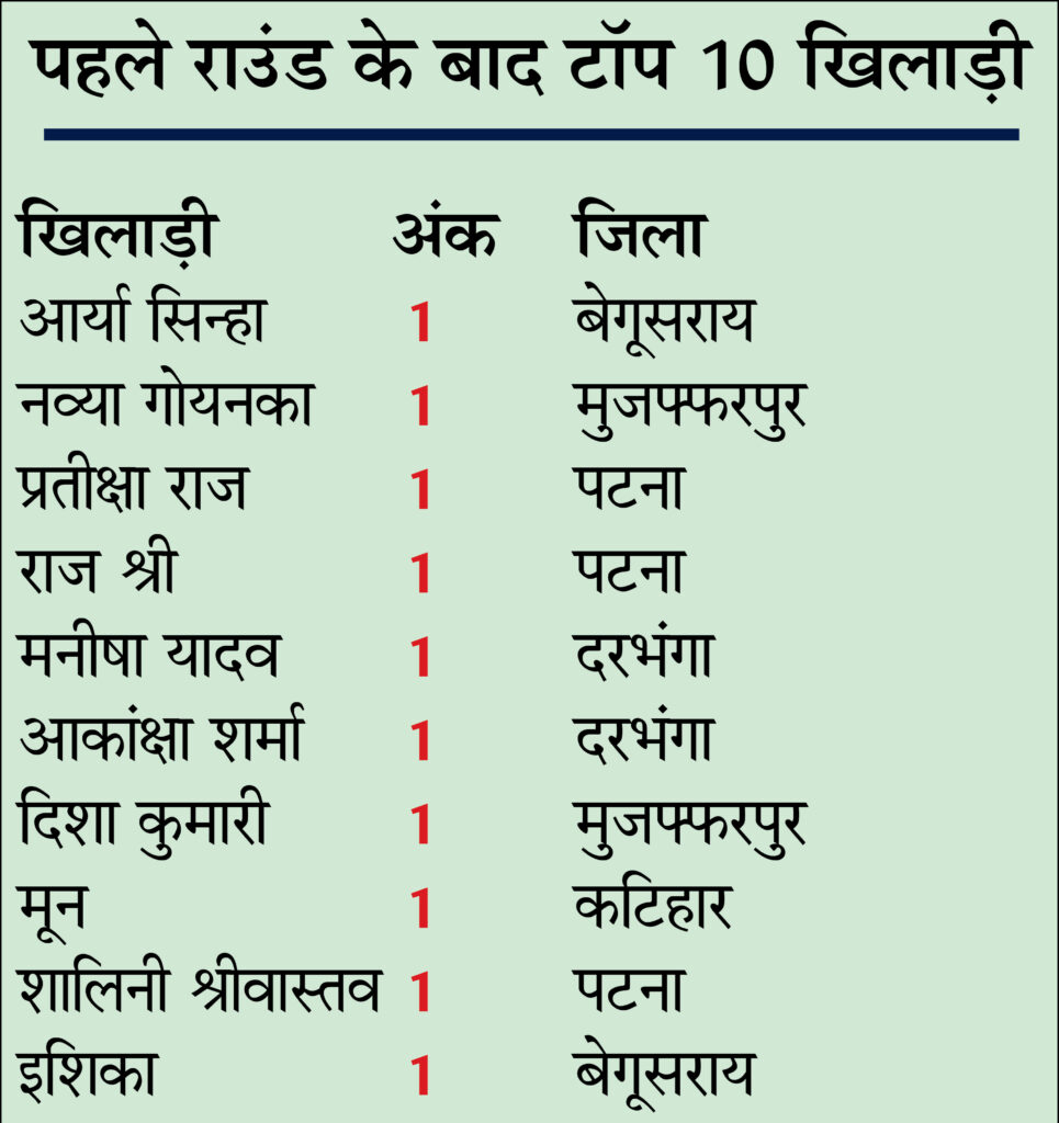 बेगूसराय की आर्या सिन्हा को काले माेहरे से ऐश्वर्या शुक्ला के खिलाफ खेलना था, लेकिन आर्या सिन्हा को वॉकओवर मिल गया। वहीं सफेद मोहरे से खेलते हुए पटना की शालिनी श्रीवास्तव ने बेगूसराय की आर्या करण को, मुजफ्फरपुर की नव्या गाेयनका ने अवनी शर्मा को, बेगूसराय की इशिका ने बेगूसराय की भाव्या गार्गी को, पटना की प्रतीक्षा राज ने बेगूसराय की चित्रांशी प्रियदर्शिनी को, मुजफ्फरपुर की दिशा कुमारी ने पटना की आरोही सागर को, किशनगंज की दृष्टि दिव्या प्रमाणिक ने सहरसा की जिया सिंह को, दरभंगा की मनीषा यादव ने खगड़िया की कुमारी आयुषी प्रिया को, दरभंगा की आकांक्षा शर्मा ने बेगूसराय की सिमरन सिन्हा को, मुंगेर की आराध्या प्रकाश ने लखीसराय की वैष्णवी को और पटना की वंशिका माहेश्वरी ने मुजफ्फरपुर की अग्रिमा राज को हराया। वहीं पटना की राजश्री और कटिहार की मून को वॉकओवर मिला।