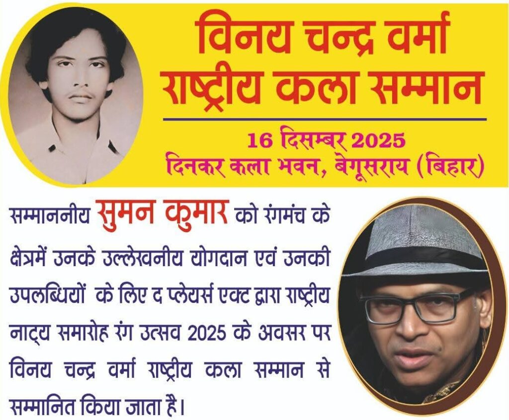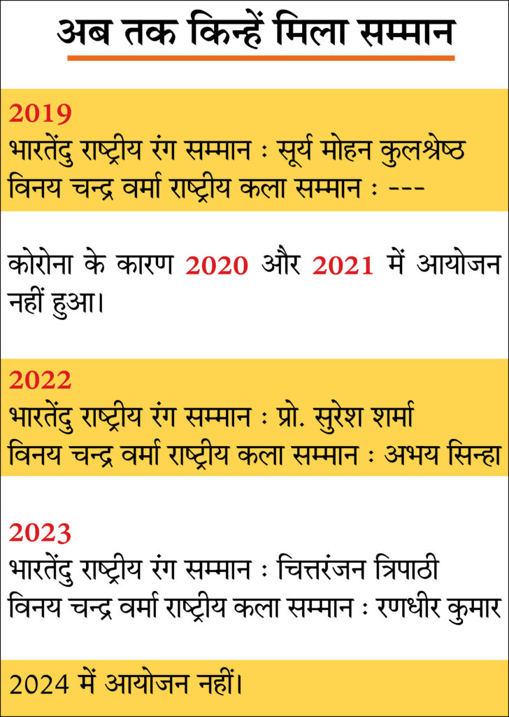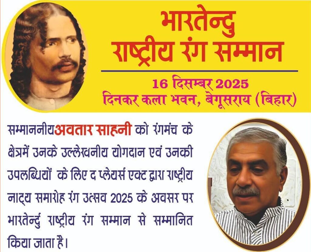 द प्लेयर्स एक्ट की ओर से दो वरिष्ठ रंग कर्मियों को प्रतिष्ठित भारतेंदु राष्ट्रीय रंग सम्मान एवं विनय चन्द्र वर्मा राष्ट्रीय कला सम्मान दिया गया। सम्मानित होने वाले रंगकर्मियों को पुष्प गुच्छ, अंग वस्त्र, प्रतीक चिन्ह, प्रशस्ति पत्र और 11 हजार की सम्मान राशि दी गई। पूरे आयोजन और कार्यक्रम का मंच संचालन युवा कवि व रंगकर्मी दीपक कुमार ने किया।