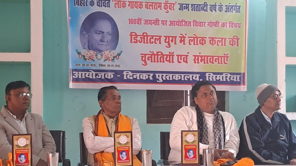 बेगूसराय। दिनकर पुस्तकालय सिमरिया के प्रांगण में शुक्रवार को बादल भवन में बिहार के चर्चित लोकगायक बलराम कुंवर की 100वीं जयंती मनाई गई। इस अवसर पर डिजिटल युग में लोक कला की चुनौतियां व संभावनाएं विषयक विचार गोष्ठी की अध्यक्षता दिनकर पुस्तकालय के वरिष्ठ सदस्य पूर्व प्रधानाचार्य विजय कुमार चौधरी एवं संचालन वरिष्ठ पत्रकार प्रवीण प्रियदर्शी ने किया। धन्यवाद ज्ञापन पुस्तकालय के सचिव संजीव फिरोज ने किया। अतिथियों का स्वागत दिनकर पुस्तकालय के अध्यक्ष विश्वंभर सिंह ने किया। विचार गोष्ठी को संबोधित करते हुए वरिष्ठ रंगकर्मी अनिल पतंग ने कहा कि बलराम कुंवर हमसबों के पुरोधा हैं। लोक कला के लिए वे आजीवन कार्य करते रहे। आज लोक कला संकट में है।