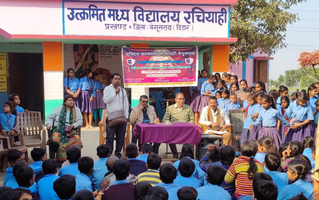 बेगूसराय | एक्टिव कल्चरल सोसायटी बेगूसराय की ओर से आयोजित एवं उत्क्रमित मध्य विद्यालय रचियाही के सहयोग से 10 दिवसीय रंग उमंग नाट्य कार्यशाला का शुभारंभ बुधवार को किया गया। कार्यक्रम के प्रथम सत्र में स्कूल के प्रधानाध्यापक संजय कुमार पोद्दार, शिक्षिका अर्चना कुमारी, कुमारी अनामिका, डोली कुमारी, पूनम राय, शिक्षक अर्जुन कुमार, सियाराम राय, संस्था के अध्यक्ष रवि शंकर रंक, सचिव इम्तियाजुल हक डब्लू, कार्यशाला निर्देशक मनोज कुमार ने दीप प्रज्वलित कर विधिवत उद्घाटन किया।