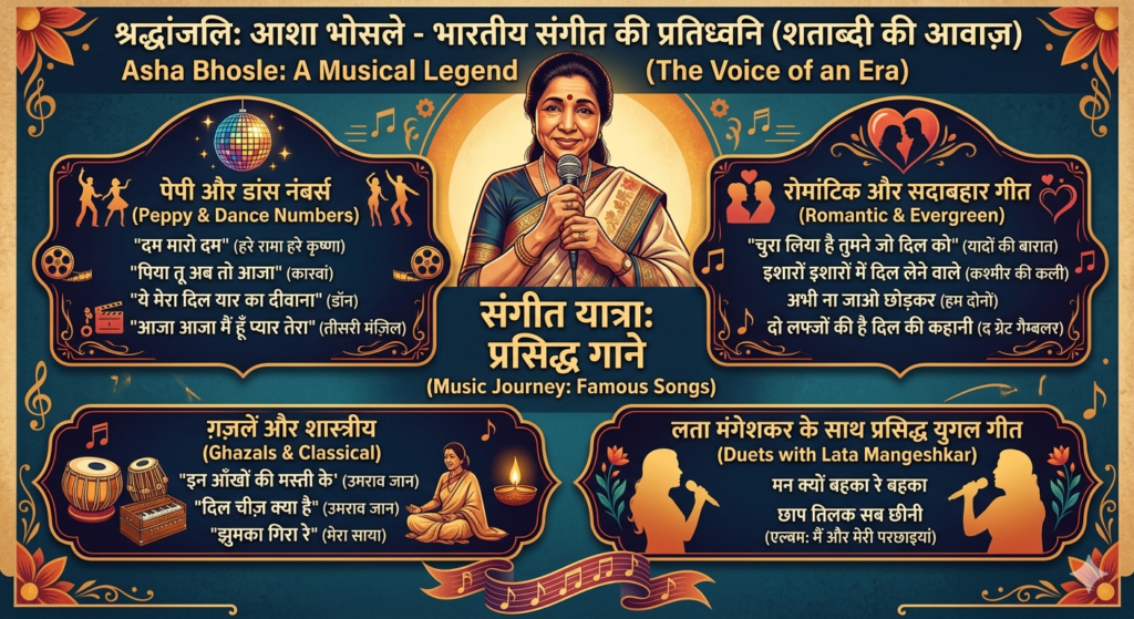 आशा भोसले ने अपने करियर में आठ दशकों से भी ज्यादा समय तक संगीत जगत में योगदान दिया। उन्होंने अपने करियर में तकरीबन 12 हजार से ज्यादा गाना गाए हैं, जिनमें ‘पिया तू अब तो आजा’, ‘दम मारो दम’, ‘ये मेरा दिल’, ‘चुरा लिया है तुमने’, ‘इन आंखों की मस्ती के’, ‘दिल चीज क्या है’ जैसे सुपरहिट गाने शामिल हैं। उन्होंने गजल, भजन, पॉप और क्लासिकल हर शैली में अपनी आवाज का जादू बिखेरा। उन्होंने ओपी नैयर, आरडी बर्मन और एआर रहमान के साथ मिलकर कई यादगार गीत दिए। उन्हें राष्ट्रीय पुरस्कार, फिल्मफेयर अवॉर्ड, दादासाहेब फाल्के सम्मान और पद्म विभूषण जैसे प्रतिष्ठित पुरस्कारों से नवाजा जा चुका है। आशा भोसले पहली भारतीय सिंगर थीं जो ग्रैमी अवॉर्ड के लिए नॉमिनेट हुई थीं। उन्होंने 20 से ज्यादा भाषाओं में गाना गाया था।