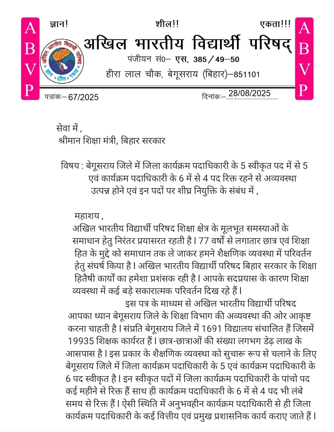 जिला शिक्षा कार्यालय की दुर्दशा पर विद्यार्थी परिषद के पत्र का असर , एक जिला कार्यक्रम पदाधिकारी का हुआ पदस्थापन August 30, 2025 Read More »
